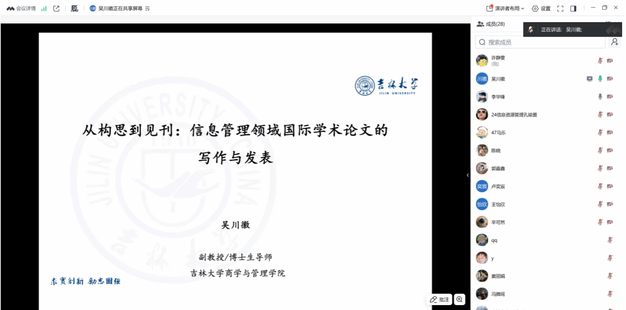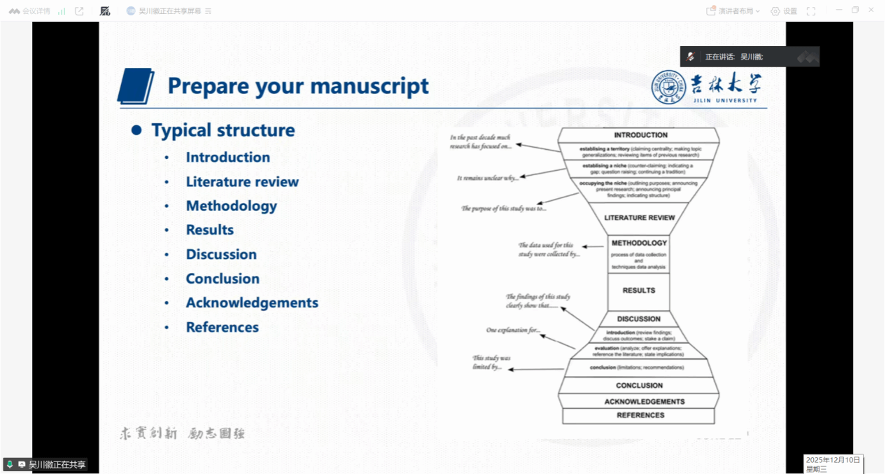 主讲人吴川徽副教授以“从构思到见刊:信息管理领域国际学术论文的写作与发表”为主题,系统阐述了高水平英文学术论文的撰写要点与投稿经验。他首先指出,英文论文写作须坚持“规范与逻辑并重”的原则,严格遵守国际期刊的通用框架,包括引言、文献综述、研究方法、结果、讨论、结论等核心部分。在文献综述环节,他建议采用表格形式系统梳理前人研究的方法、样本与结论,从而清晰定位自身研究的创新切入点;在讨论部分,则应从理论贡献与实践价值两个维度深入阐释研究意义,并逐一回应前言中提出的研究问题。此外,主讲人特别提醒在撰写过程中需注意避免中式英语表达,确保语言符合国际学术惯例。