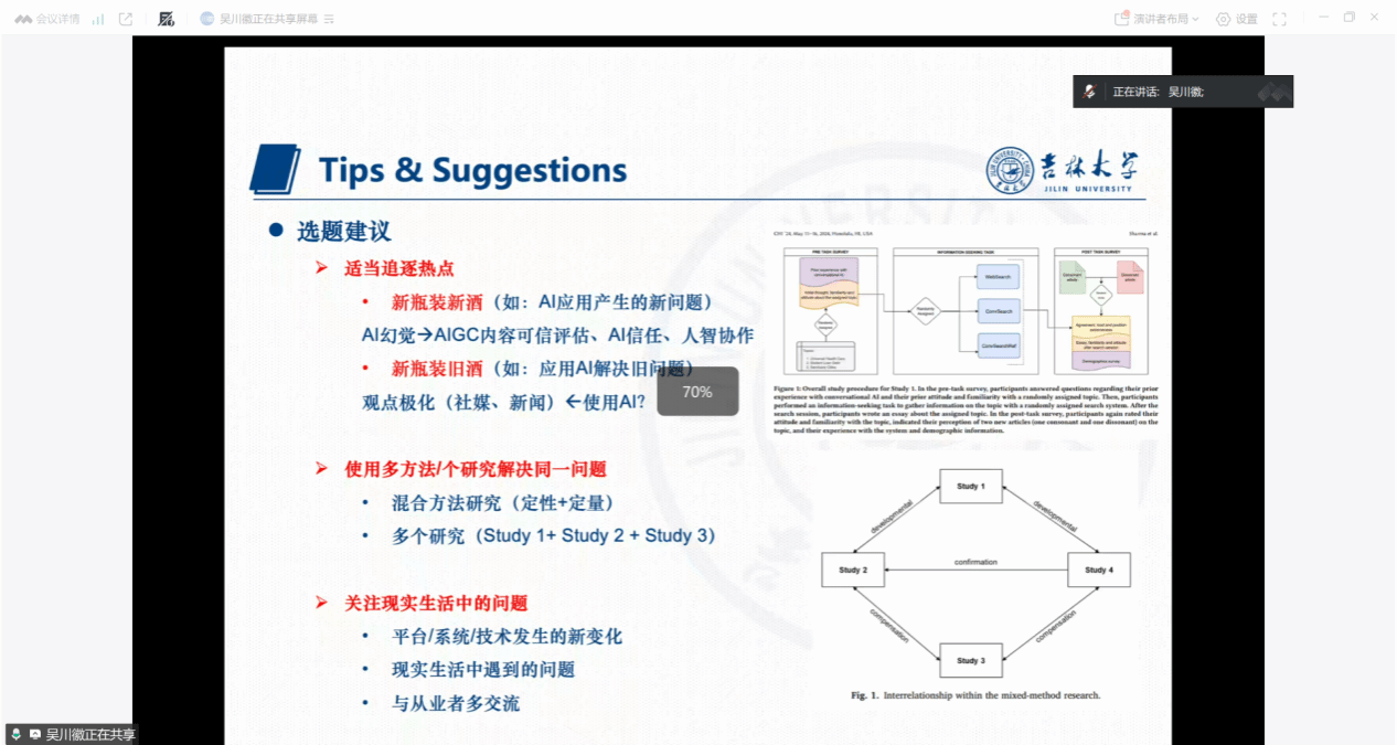 讲座的最后部分,主讲人就研究选题提出了三项具体建议:一是积极追踪学科前沿与时事热点,二是注重多方法或混合方法的运用,三是立足现实,关注具有实践意义的具体问题。在互动环节中,吴川徽副教授耐心解答了研究生们提出的多个问题,现场交流热烈,氛围融洽。